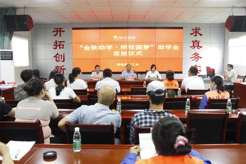 8月28日上午,明佳集團(tuán)工會(huì)“金秋助學(xué)·明佳圓夢(mèng)”助學(xué)金發(fā)放儀式在集團(tuán)公司三樓會(huì)議室舉行,為8個(gè)考取大學(xué)的職工子女發(fā)放助學(xué)金共計(jì)9600元?偛藐愒啤⒏笨偨(jīng)理鐘寒參加發(fā)放儀式,儀式由工會(huì)主席高斐斐主持。